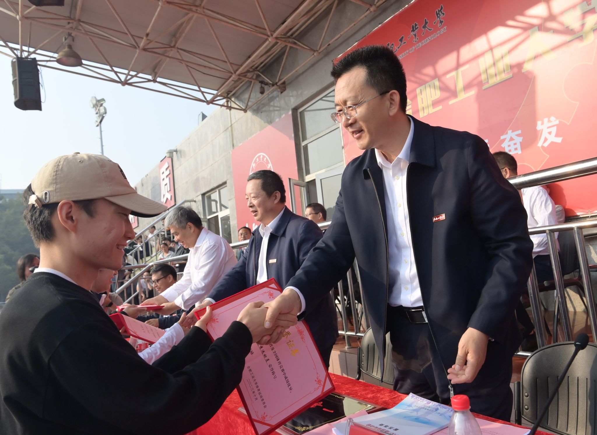 校党委副书记陈刚宣读《关于表彰合肥工业大学2022-2023年度优秀运动员决定》《关于表彰合肥工业大学2022年学生体质健康测试优秀学院的决定》,与会领导为获表彰的同学和单位颁发奖牌。