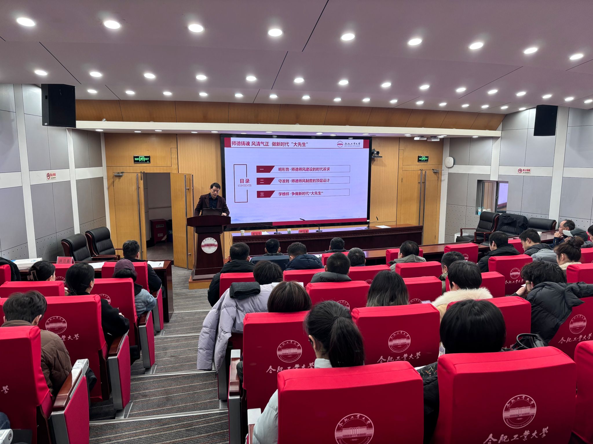 随后,钟华勇作《师德铸魂 风清气正》师德师风专题教育报告。报告立足新时代师德师风建设的时代要求与顶层设计,深刻阐释了师德师风作为评价教师队伍素质第一标准的重要意义,系统解读了《新时代高校教师职业行为十项准则》及学校近期印发的《合肥工业大学教师师德违规行为处理办法》《合肥工业大学师德考核实施办法》等制度文件。报告还宣传了人民教育家、全国模范教师以及校内黄大年式教师团队的先进事迹,号召大家见贤思齐,争做“四有”好老师,当好学生成长的引路人。同时,报告通过剖析近年来教育系统十起违反教师职业行为准则的典型案例开展警示教育,以案明纪、以案为鉴,警示全体教师严守师德底线,规范职业行为,自觉抵制失范行为,将师德规范内化于心、外化于行,以高尚的师德师风引领体育育人实践走深走实。